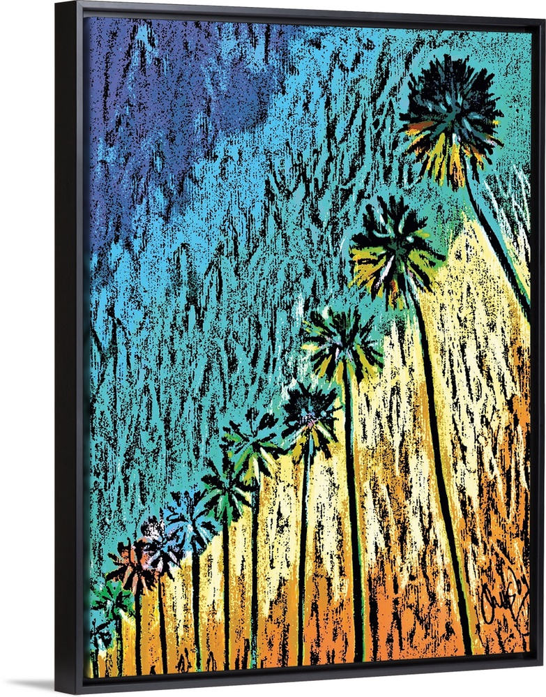 <p>Contemporary piece of art of a row of tall palm trees. In a modern textured style.</p>