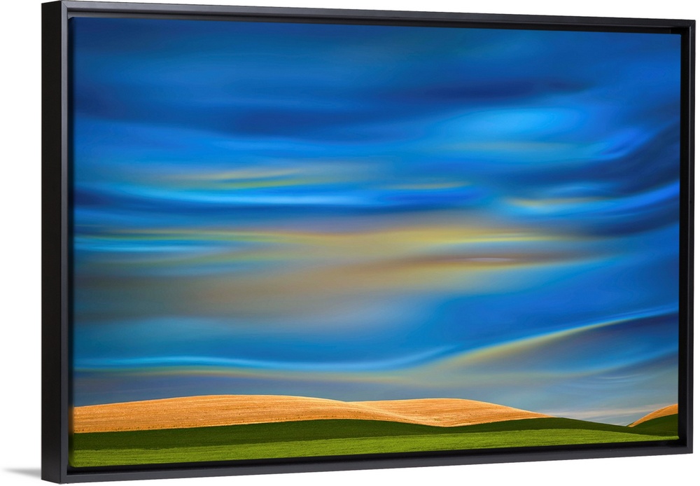 <p>Abstract photograph of the Palouse farmland in Washington state, with a vibrant blue motion blurred sky.</p>