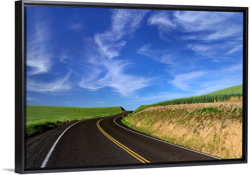 <p>Paved road through the fields of Palouse, Washington, under a blue sky.</p>