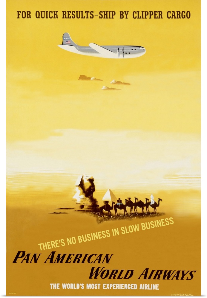 <p>This is a vertical retro advertisement of a cargo plane flying over a drawing of the Sphinx and camels in the desert to illustrate the difference in speed of ground shipments and air shipments.</p>