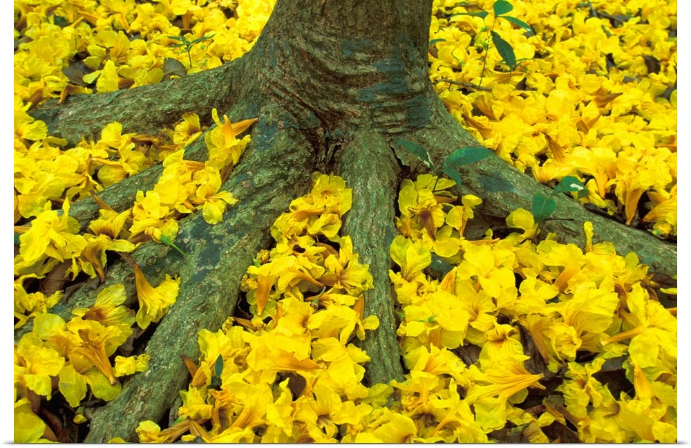 <p>Central America, Panama, Barro Colorado Island. Carpet of yellow flowers on forest floor (Tabebuia guayacan).</p>