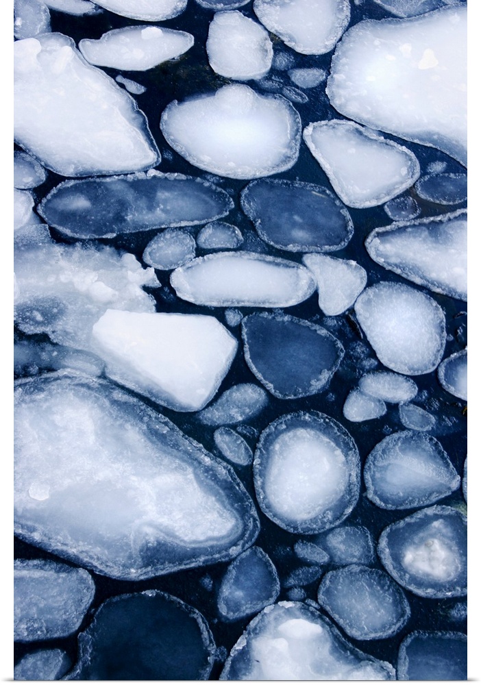 <p>Pancake ice. This free-floating ice is circular to polygonal in shape. It is ?a30-300 cm in diameter and up to 10cm thick. It forms on the surface of very cold open water covered with surface slush (frazil ice). Individual pieces of pancake ice often have raised rims formed when pieces strike against each other and slush splashes freeze at their edges.</p>