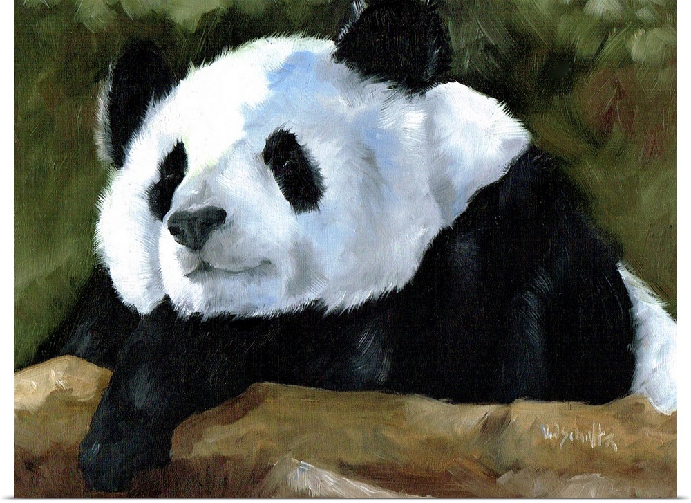<p>Painting of a panda bear relaxing on a log.</p>