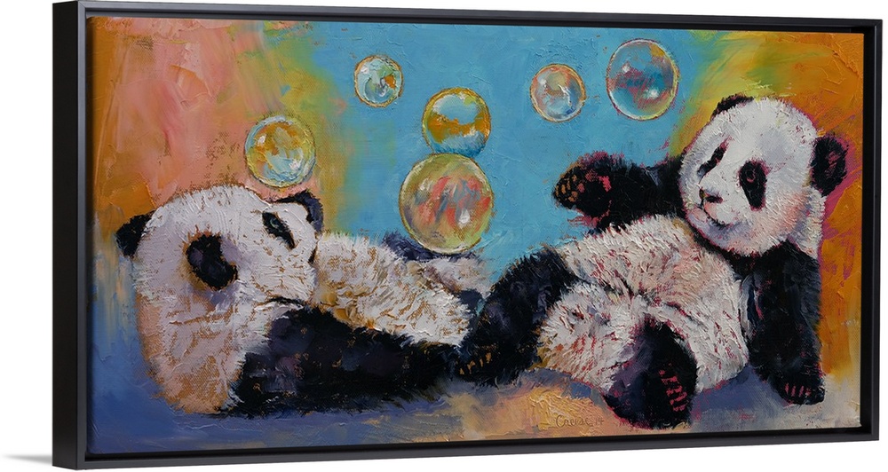 <p>A contemporary painting of two panda bears playing with bubbles.</p>
