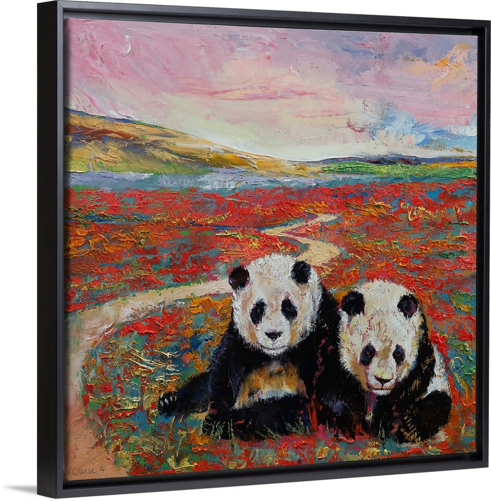 <p>A contemporary painting of two panda bears in a magical land.</p>