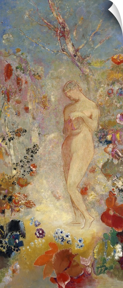 <p>Pandora was a supremely beautiful woman created by the gods and sent to Earth to live among mortals. Redon depicts her nude, in a state of perfect innocence, and surrounded by flowers, like the biblical Eve in the Garden of Eden.</p>