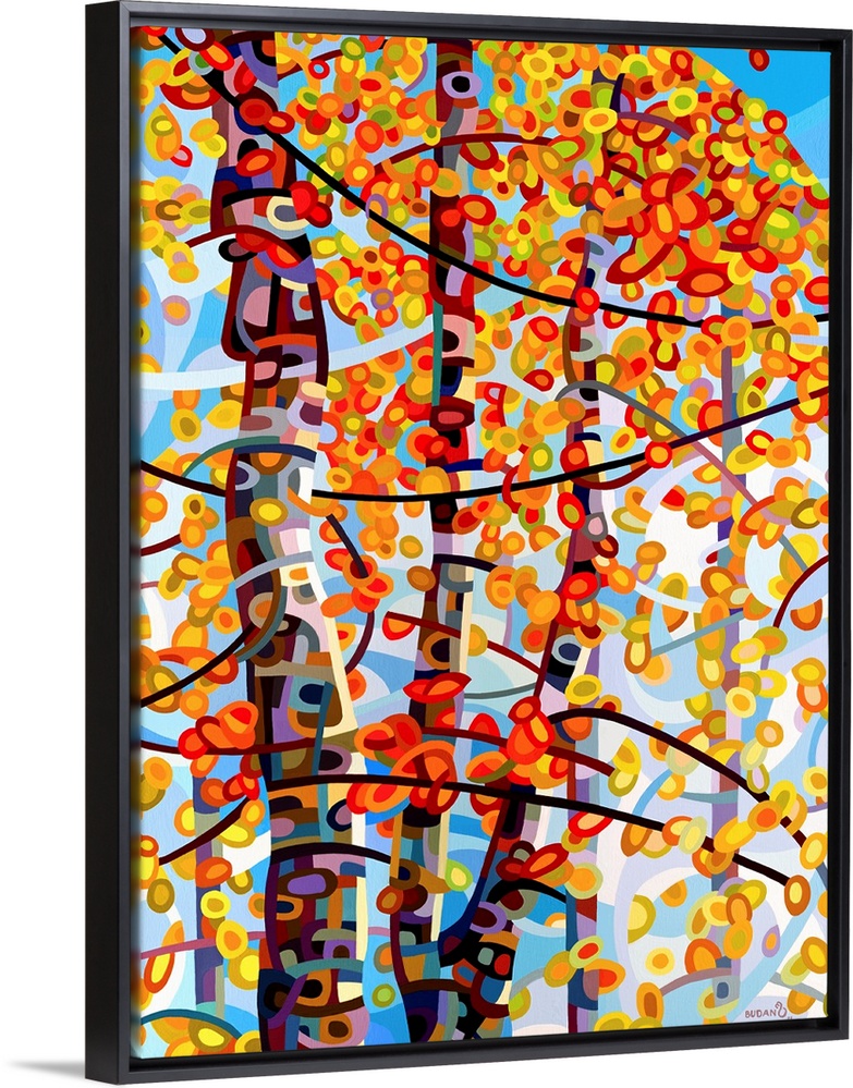 <p>Mandy Budan’s art style is more than unique. Using acrylic colors to weave lines and shapes together like a tapestry, she creates breathtaking images from the simplest forms. Though the multicolored dots of “Standing Room Only” may seem like a scattering of disparate, broken circles up close, a step back reveals a stunning forest scene reminiscent of stained glass. In “Solitaire,” a close examination reveals an intricate collection of interlocking pieces, almost like peeking at the delicate harmony of gears in a pocket watch. Yet again, a step away from the canvas transforms her design into an unrestricted dance of fluid lines and curves in a blossom. Whether it’s the soft floral pinks of “Cascade,” the gold turning crimson in “Stormlight,” or the sweeping blues of “Thaw,” wall art from Mandy Budan adds more than color to a room; it invites visitors to discover something new each time they encounter it.</p>