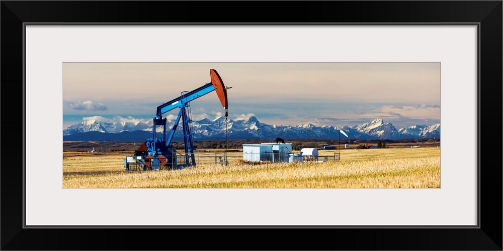 <p>Panorama of a colourful pump jack in cut canola stubble field with snow capped mountains, blue sky and clouds in the background; Alberta, Canada</p>