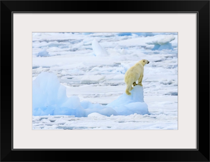 <p>Panorama of a polar bear (Ursus maritimus) climbs an iceberg for a view Svalbard, Norway</p>