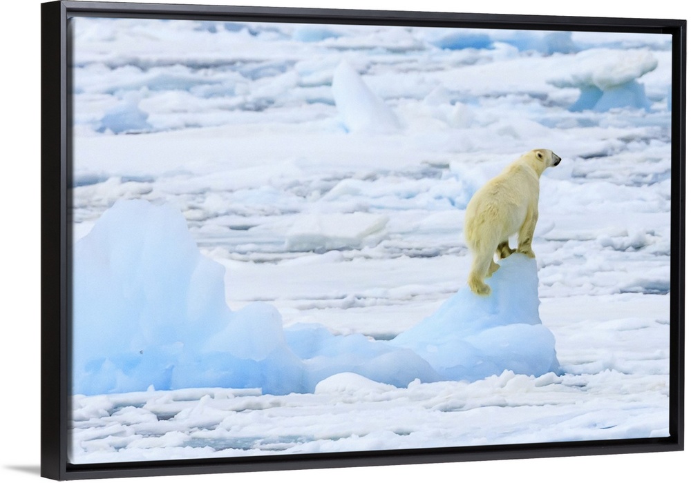 <p>Panorama of a polar bear (Ursus maritimus) climbs an iceberg for a view Svalbard, Norway</p>