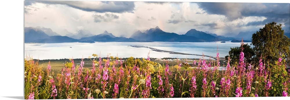 <p>Panorama Of Fireweed (Chamaenerion Angustifolium) Blossoming In The Foreground With Homer Spit, Kachemak Bay And The Kenai Mountains In The Background; Homer, Alaska, United States Of America</p>