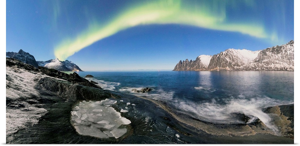 <p>Panorama of frozen sea and rocky peaks illuminated by the Northern Lights Tungeneset Senja Tromso Norway Europe</p>