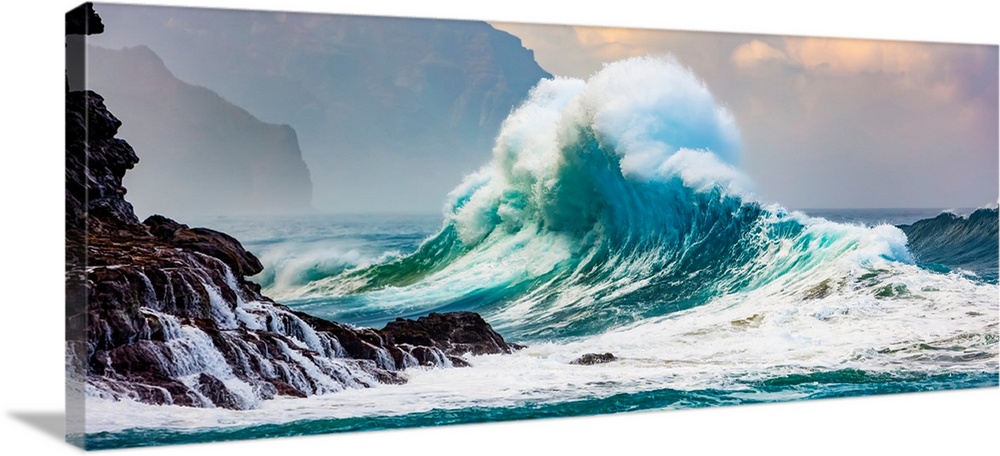 <p>Panorama of large waves crashing into the Na Pali coastline at Ke'e beach, Kauai, Hawaii, united states of America.</p>