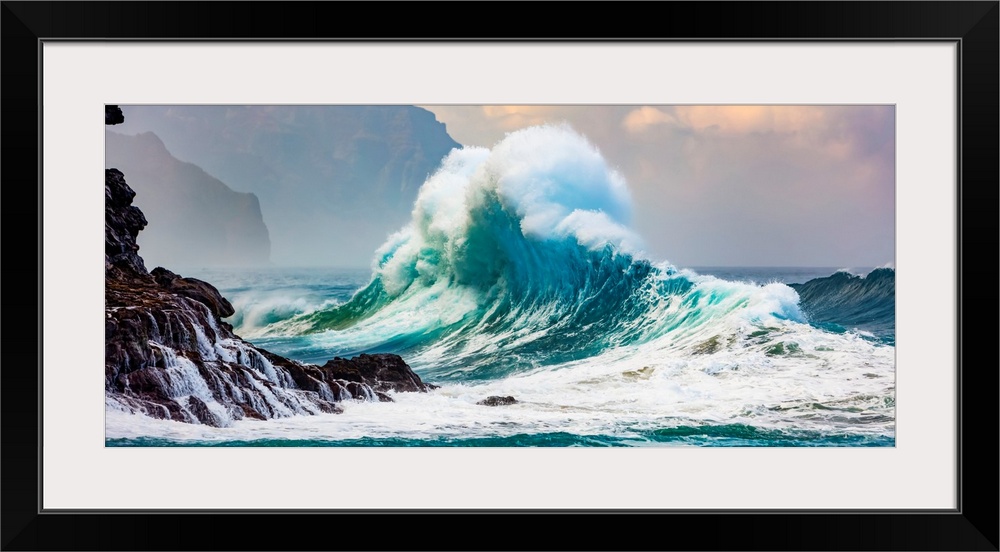 <p>Panorama of large waves crashing into the Na Pali coastline at Ke'e beach, Kauai, Hawaii, united states of America.</p>