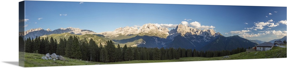 <p>Panorama of meadows and hut framed by peaks, Malga Ritorto, Madonna di Campiglio, Brenta Dolomites, Trentino-Alto Adige, Italy</p>