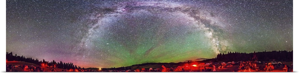 <p>July 25, 2014 - A 360 degree panorama of the Table Mountain Star Party held at the Eden Valley Guest Ranch in northern Washington state. It shows the Milky Way arching overhead (zenith is at the top), and bands of airglow streaming out of the east at centre. South is to the right of centre where the bright centre of the Galaxy area meets the horizon. The Big Dipper is at the left of the frame.</p>