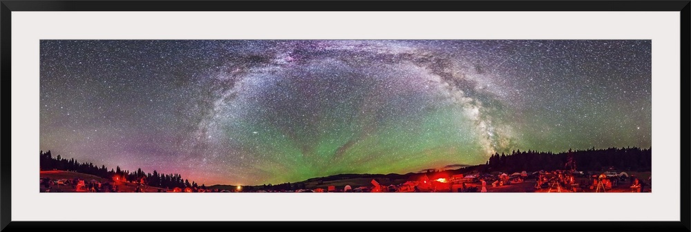 <p>July 25, 2014 - A 360 degree panorama of the Table Mountain Star Party held at the Eden Valley Guest Ranch in northern Washington state. It shows the Milky Way arching overhead (zenith is at the top), and bands of airglow streaming out of the east at centre. South is to the right of centre where the bright centre of the Galaxy area meets the horizon. The Big Dipper is at the left of the frame.</p>