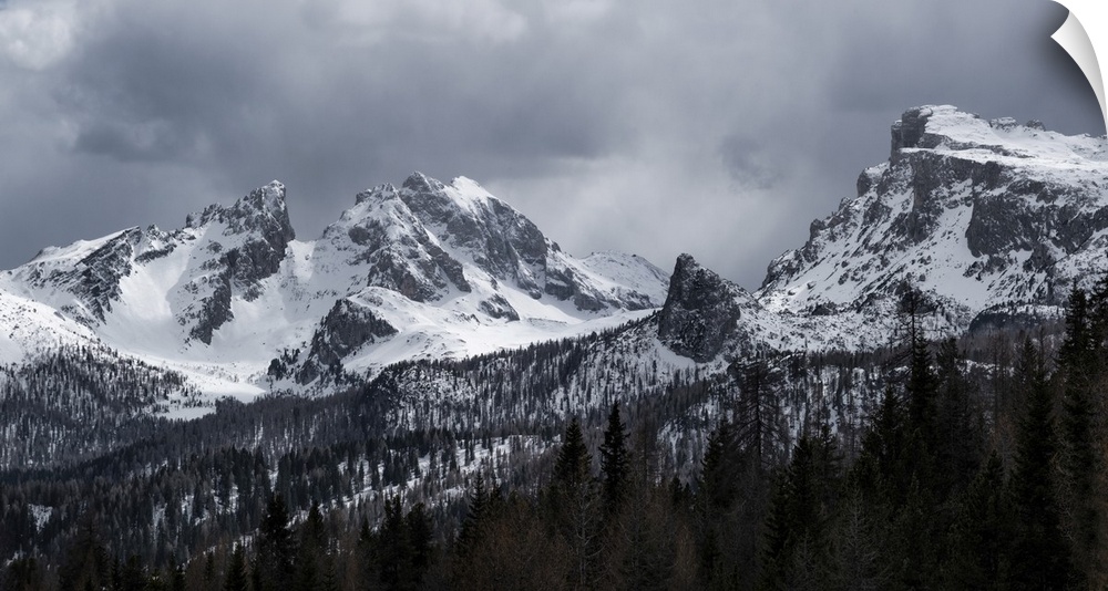 <p>Panorama of Monte Cernera and Ra Gusela mountains at Passo Giau covered by snow, Dolomites, Belluno, Italy, Europe</p>