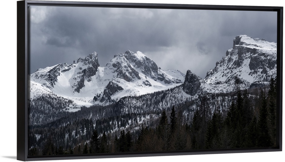 <p>Panorama of Monte Cernera and Ra Gusela mountains at Passo Giau covered by snow, Dolomites, Belluno, Italy, Europe</p>