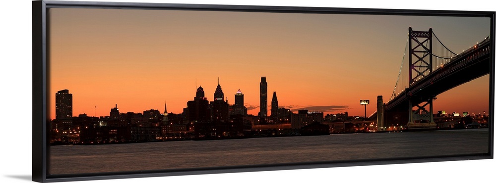 <p>Long horizontal image of the silohuette of the skyline of Philadelphia along the water front with a bridge on the right leading up to it.</p>