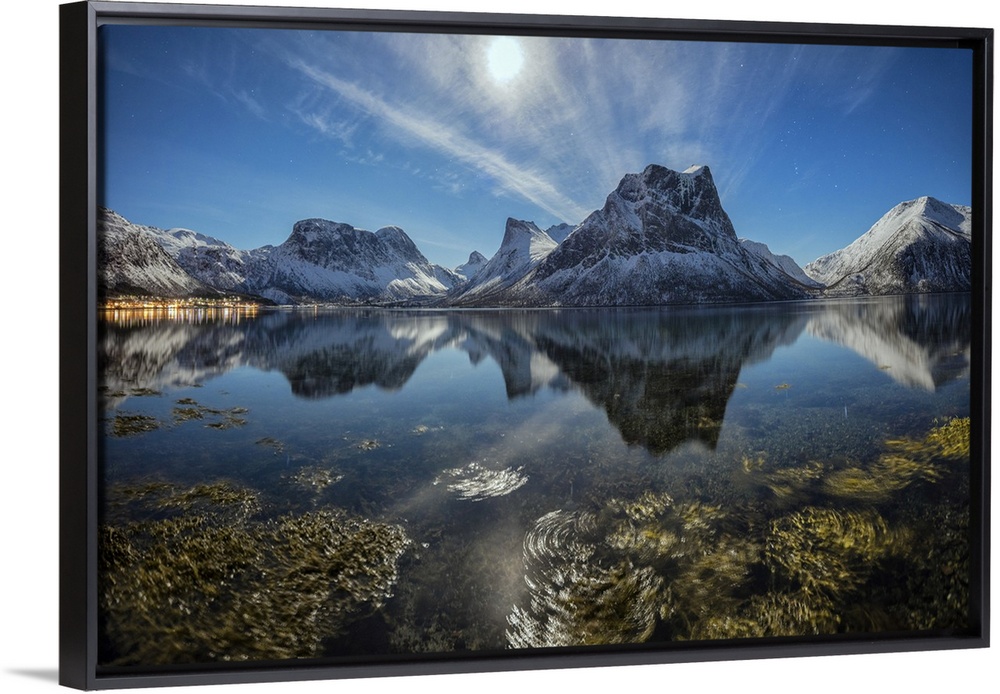 <p>Panorama of snowy peaks reflected in sea in a cold starry night, Bergsbotn, Senja, Troms County, Norway, Scandinavia, Europe</p>