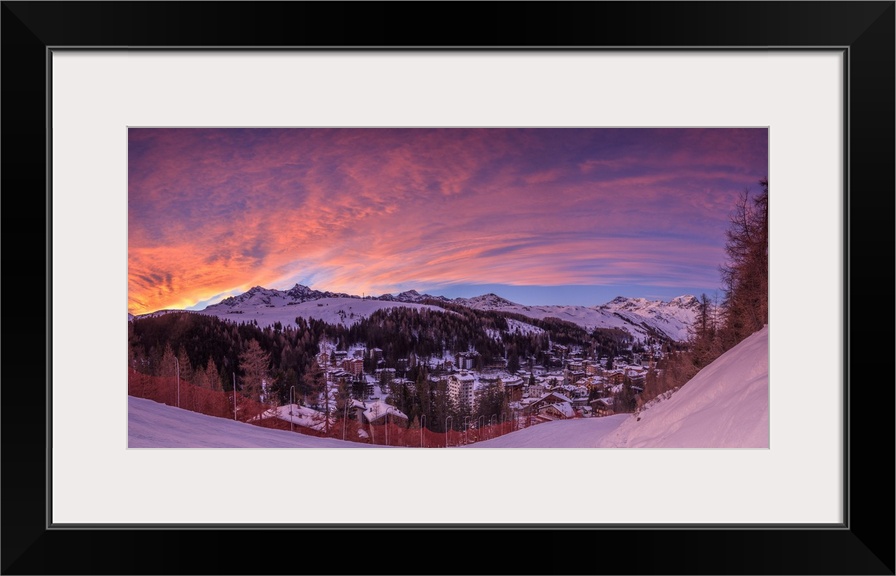 <p>Panorama of the alpine village of Madesimo and snowy ski slopes at sunset Spluga Valley Valtellina Lombardy italy Europe</p>