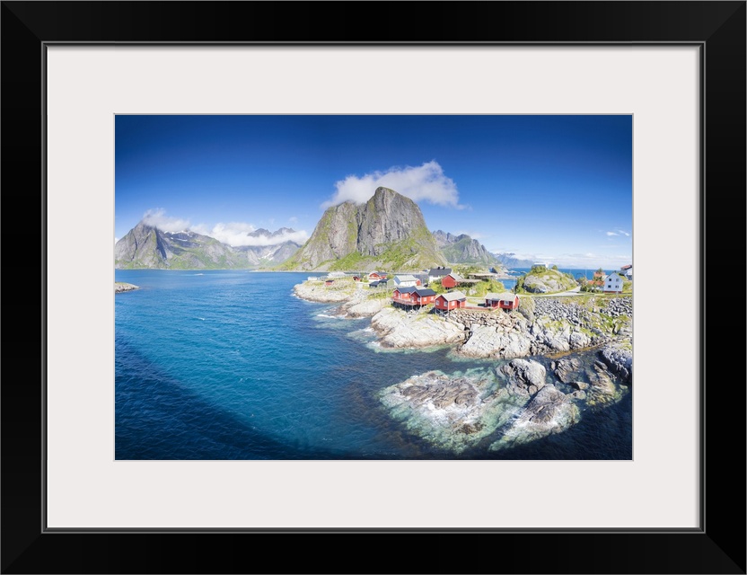<p>Panorama of the fishing village framed by blue sea and high peaks, Hamnoy, Moskenesoya, Nordland county, Lofoten Islands, Norway, Scandinavia, Europe</p>