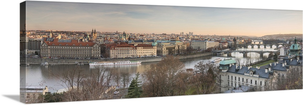 <p>Panorama of the historical bridges and buildings reflected on Vltava River at sunset, Prague, Czech Republic</p>