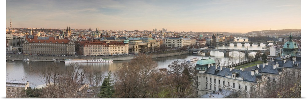 <p>Panorama of the historical bridges and buildings reflected on Vltava River at sunset, Prague, Czech Republic</p>