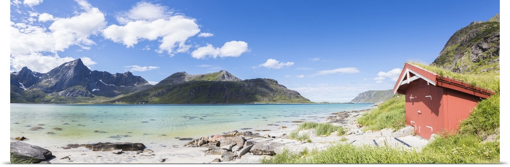 <p>Panorama of the turquoise sea surrounded by peaks and typical house of fishermen, Strandveien, Lofoten Islands, Norway, Scandinavia, Europe</p>