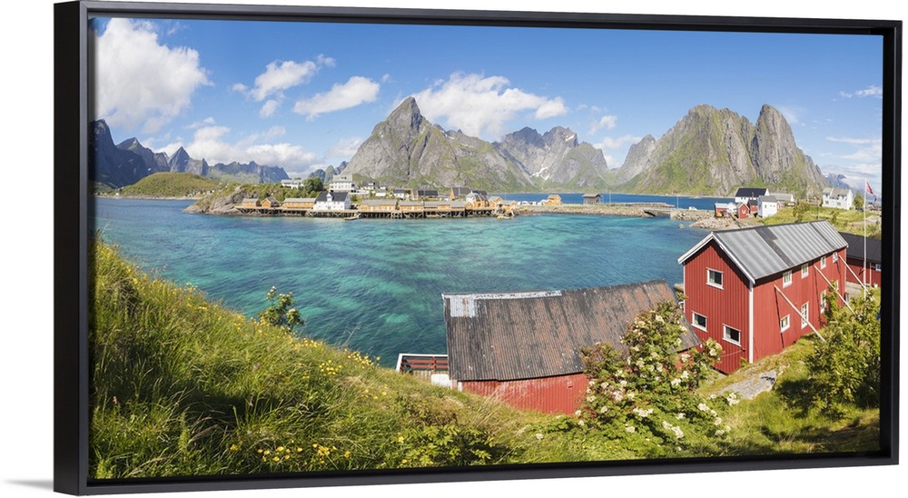 <p>Panorama of turquoise sea and typical fishing village surrounded by rocky peaks, Sakrisoy, Reine, Moskenesoya, Lofoten Islands, Norway, Scandinavia, Europe</p>