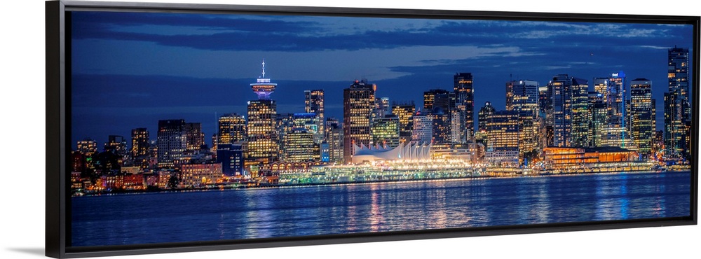 <p>Panorama of Vancouver skyline at night in British Columbia, Canada.</p>