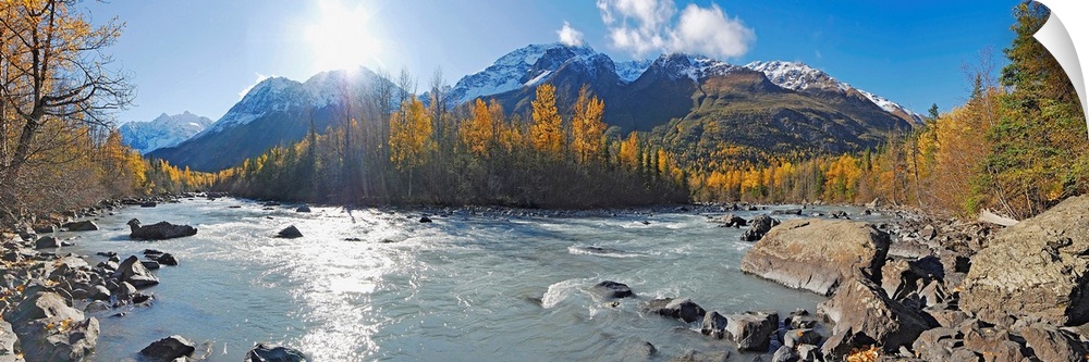 <p>A photograph of a river running through the Alaskan landscape in lined with trees on a sunny day in this panoramic wall art.</p>