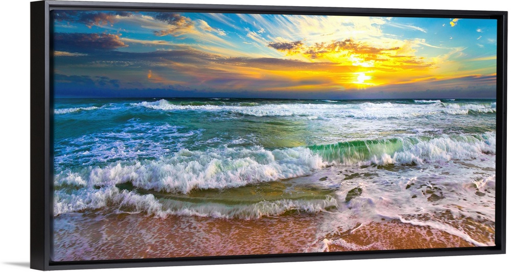 <p>This panoramic beach sunset features breaking waves on a beautiful sea shore. A wave crashes on the shore before an orange sunset on the beach with amazing clouds.</p>