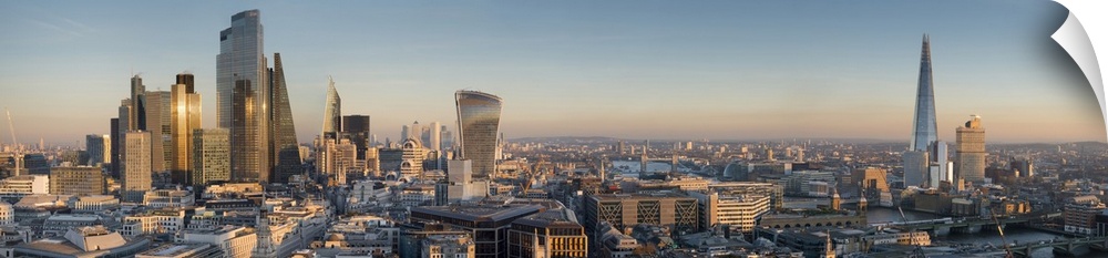 <p>Panoramic cityscape and skyline of London with The Shard, 20 Fenchurch and various other skyscrapers at dusk; London, England.</p>