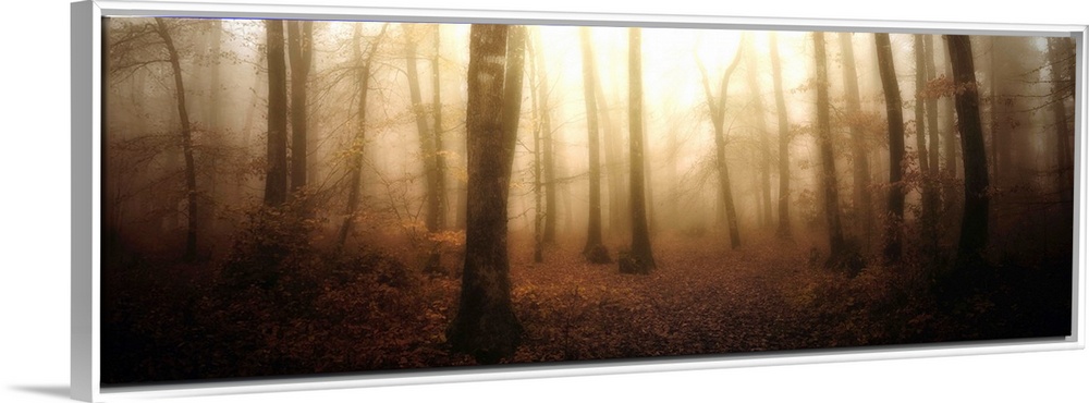 <p>A misty and ethereal forest of young, thin trees glows in the morning light. This panoramic photograph has high contrast and an emphasis on drama rather than detail.</p>
