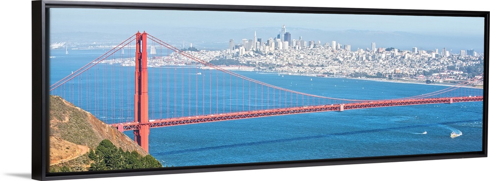 <p>Panoramic photograph of the bright red Golden Gate Bridge with San Francisco in the background.</p>