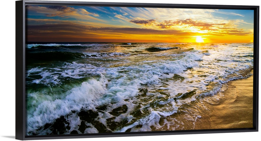 <p>A panoramic landscape featuring a beautiful sunset over the sea. Golden light hits the crashing waves during the early morning daybreak. This panoramic landscape can be printed very large with incredible detail making it a beautiful sunset art print.</p>