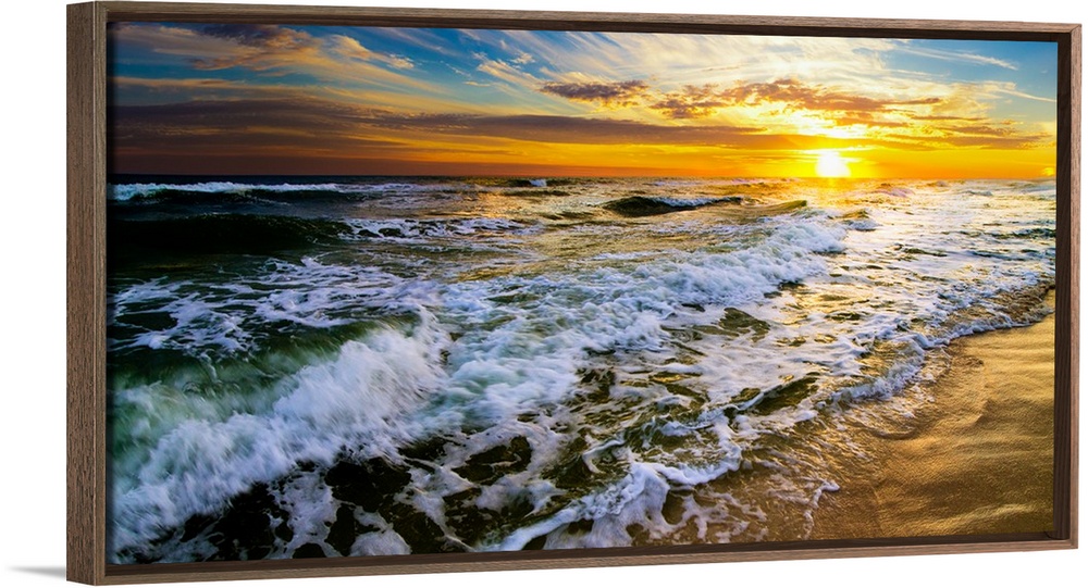 <p>A panoramic landscape featuring a beautiful sunset over the sea. Golden light hits the crashing waves during the early morning daybreak. This panoramic landscape can be printed very large with incredible detail making it a beautiful sunset art print.</p>