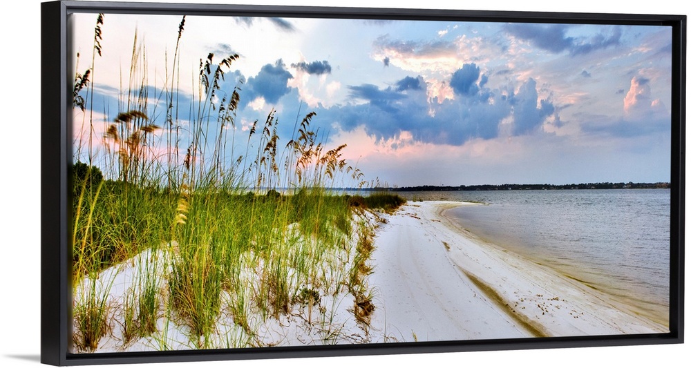 <p>A panoramic with blue and purple clouds over a grassy beach. Sea Oats can be seen reaching into the sky. Landscape taken near Navarre, Florida.</p>