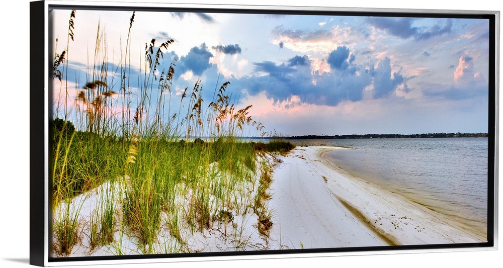 <p>A panoramic with blue and purple clouds over a grassy beach. Sea Oats can be seen reaching into the sky. Landscape taken near Navarre, Florida.</p>