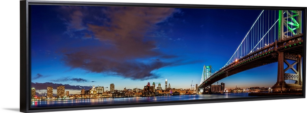 <p>Panoramic view of Philadelphia city skyline at night with Ben Franklin Bridge.</p>