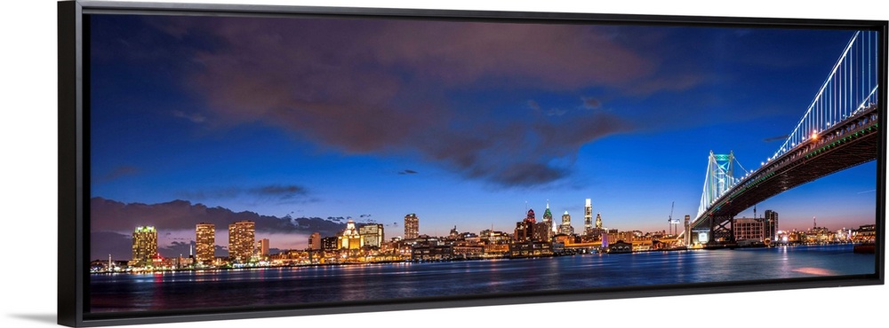 <p>Panoramic view of Philadelphia city skyline at night with Ben Franklin Bridge.</p>