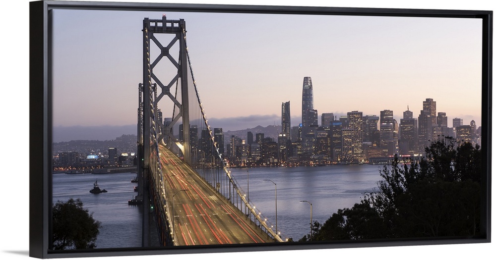 <p>Photograph of the Bay Bridge with a pink and purple sunset and the San Francisco skyline lit up in the background.</p>