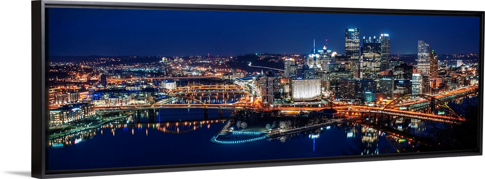 <p>Panoramic photo of downtown Pittsburgh at night with Point State park.</p>