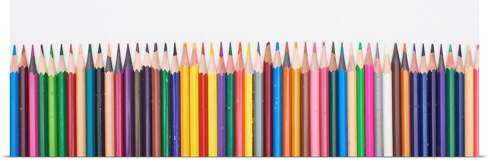 <p>Panoramic shot of straight line of color pencils isolated on white.</p>