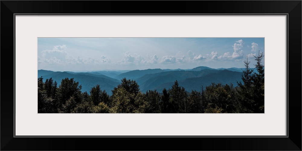 <p>Panoramic shot of trees and mountains against sky with clouds.</p>