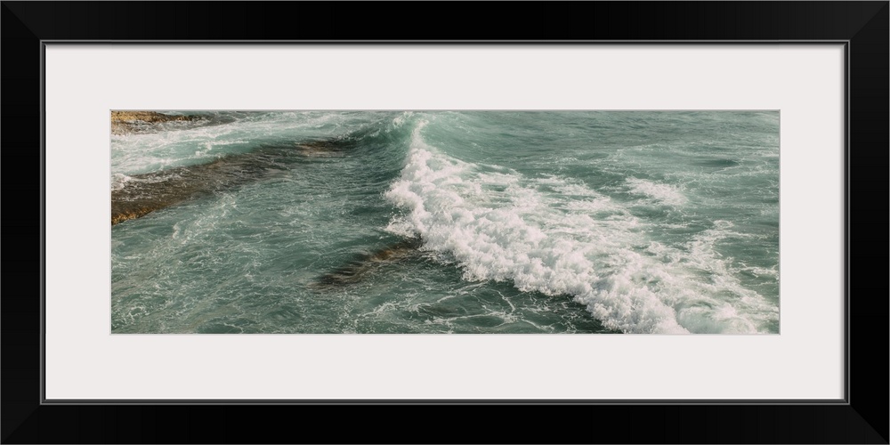 <p>Panoramic shot of white foam in blue water of mediterranean sea.</p>