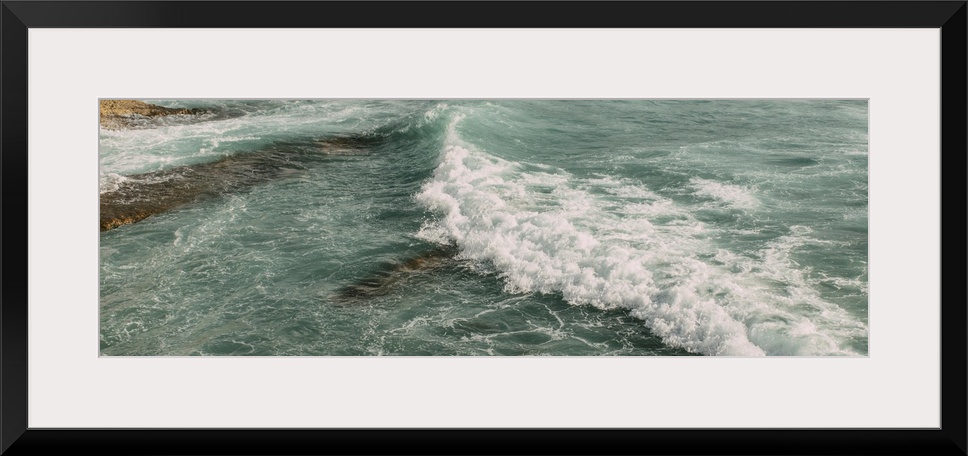 <p>Panoramic shot of white foam in blue water of mediterranean sea.</p>