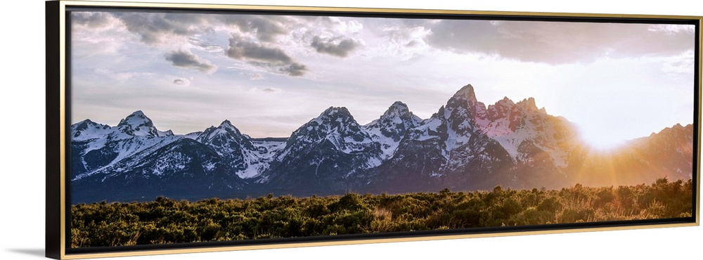 <p>Panoramic view of the sun rising over Teton mountains in Wyoming.</p>